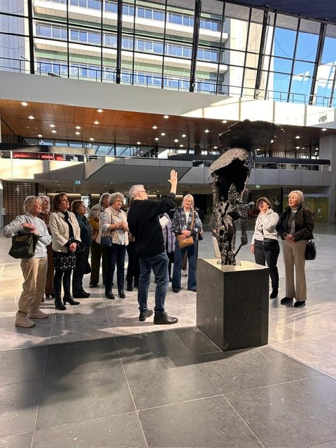 Het was een geslaagde middag, ons bezoek aan het indrukwekkende Provinciehuis. De hoge toren van 23 verdiepingen is ‘eye-catcher’ langs de A2 waar je al -tig keer langsgereden bent op weg naar Amsterdam. Ton, onze gids vertelde dat het ’t laatste bouwwerk was van de Rotterdammer Huig Maaskant (1907-1977). Maaskant was één van de architecten die uitgenodigd was om deel te nemen aan de prijsvraag om een ontwerp te maken voor het nieuw te bouwen Provinciehuis. Maaskant pleitte voor het gebruik van moderne materialen zoals beton, glas en staal, deze gebruikte hij voor de buitenkant. (Brutalistische bouwstijl) Voor het interieur gebruikte hij sobere materialen als natuursteen, wol en leer. En overal staat of hangt kunst; prachtige wandkleden, bronzen beelden en schilderijen o.a. van Corneille en Karel Appel. Vanaf de 23e verdieping heb je een prachtig uitzicht over de stad en verre omgeving. Bij helder weer kun je zelfs de Pagode van de Efteling zien. Het viel ons op dat ’t zo rustig was daar binnen.. Je zou niet zeggen dat er 1300 mensen werken daar, weliswaar op flexibele werkplekken.