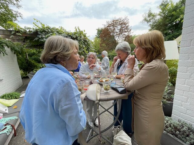 We werden om 17.00 uur verwacht bij Annette, onze nieuwe voorzitter. We konden nog naar buiten in haar mooie tuin, want het zonnetje scheen! Daar werden we getrakteerd op een heerlijk welkomstdrankje. Er was een kleinere opkomst, vele leden waren nog op vakantie in september! Het Bestuur was wel compleet en had er alles aan gedaan om de dames in de watten te leggen met hapjes vooraf, in de Italiaanse sfeer. Door ieder van hen klaargemaakt, daarvoor onze complimenten! Het was fijn om elkaar weer terug te zien! Annette opende de middag om ons welkom te heten. Haar devies voor dit jaar was: ‘KEEP IT GOING STRONG.’ We hebben de afgelopen jaren nogal wat meegemaakt met zieke leden en moeilijke omstandigheden waardoor zij moesten verzuimen! Ook waren er twijfels over ons voortbestaan. Toch gaan we het nieuwe jaar met vertrouwen en veel animo tegemoet! Daar moest natuurlijk op gedronken worden. Toen het wat kouder werd zijn we binnen gegaan en aan een mooie gedekte tafel doorgegaan met het eetfestijn dat ons aangeboden werd. Een gerechtje met burrata, een kopje pikante soep, een heerlijk Italiaans toetje en koffie/thee na met zelf gemaakte dadelkoekjes! Doordat we met minder leden waren werd het tafelgesprek meer centraal met mooie verhalen en anekdotes. Kortom een heel geslaagde avond.